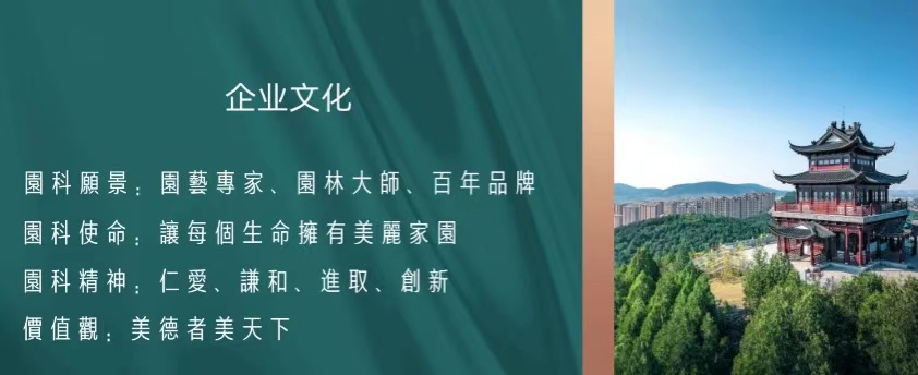 园科集团始创于一九九一年历史可追溯至于一九0 七年创办的中国近代园艺的发祥地一一苏州府官立农业学堂。集团公司以“让每个生命拥有美丽家园”为使命,业务涉足园林景观设计、施工、监理、养护;花艺造型及布景、生态建设咨询、地质灾害治理等,经过几十年的发展,已完成从传统园林景观服务商到综合型环境运营商的完美蜕变。